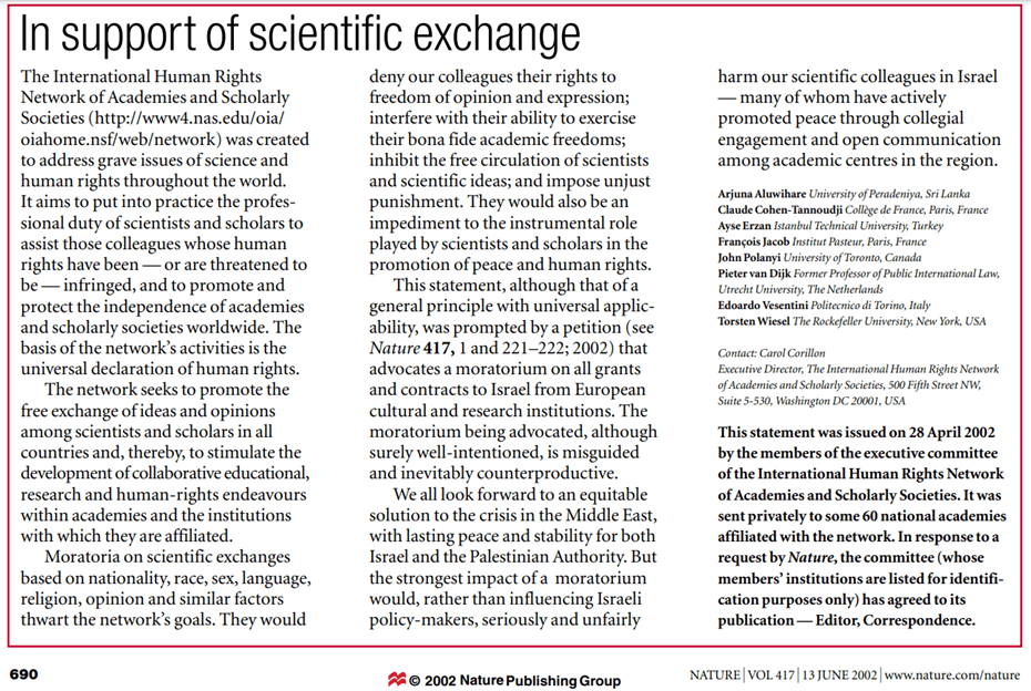 But it is clear that the universality of science cannot be a tenet of absolute inviolability. As an extreme case, imagine that the only option to prevent nuclear war was to declare a global boycott of diplomatic, trade, and cultural ties with a rogue regime. Wouldn’t the majority of scientists concur that a boycott would be appropriate?