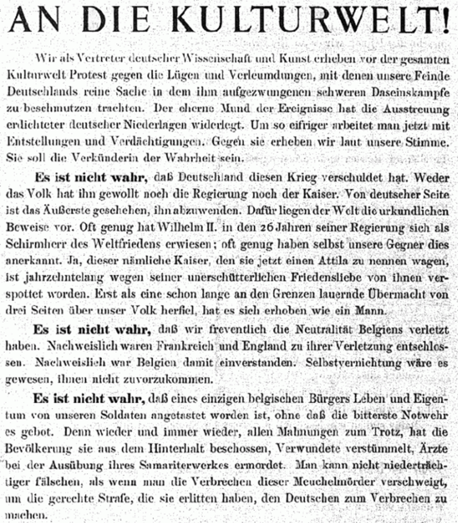 Many specific transgressions were invoked as justifications for punishing all scientists from the losing nations. The most frequently cited incitement was the notorious Manifesto of the Ninety-Three, a proclamation officially entitled ‘To the Cultured World’ that was signed by a host of literary and philosophical luminaries and released on 4 October 1914. The document aimed to defend the honour of Germany against the allegations of atrocities committed by the German troops during the invasion of Belgium. The list of prominent signatories on the document was what irritated the later boycotting scientists. Scientists like Adolf von Baeyer, Paul Ehrlich, Fritz Haber, Felix Klein, Walther Nernst, Wilhelm Ostwald, Max Planck and Wilhelm Röntgen were among the signatories.