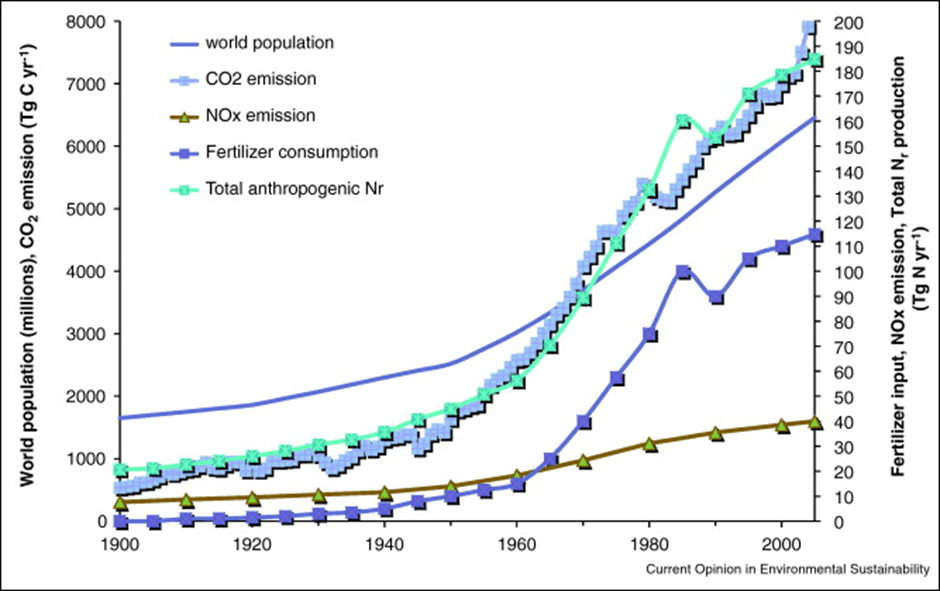 Figure 2 illustrates the rise in anthropogenic reactive nitrogen species over the past century. This increase correlates strongly with the Green Revolution and the global shift towards intensive agricultural practices. This has led to the anthropogenic disruption of the global nitrogen cycle (Wang et al., 2021, UNECE, 2021). More than half of the reactive nitrogen species (nitrates, nitrogen oxides (NOx), ammonia, urea and other amine derivatives etc.) currently found in the environment can be attributed to anthropogenic origin (Fowler et al., 2013).