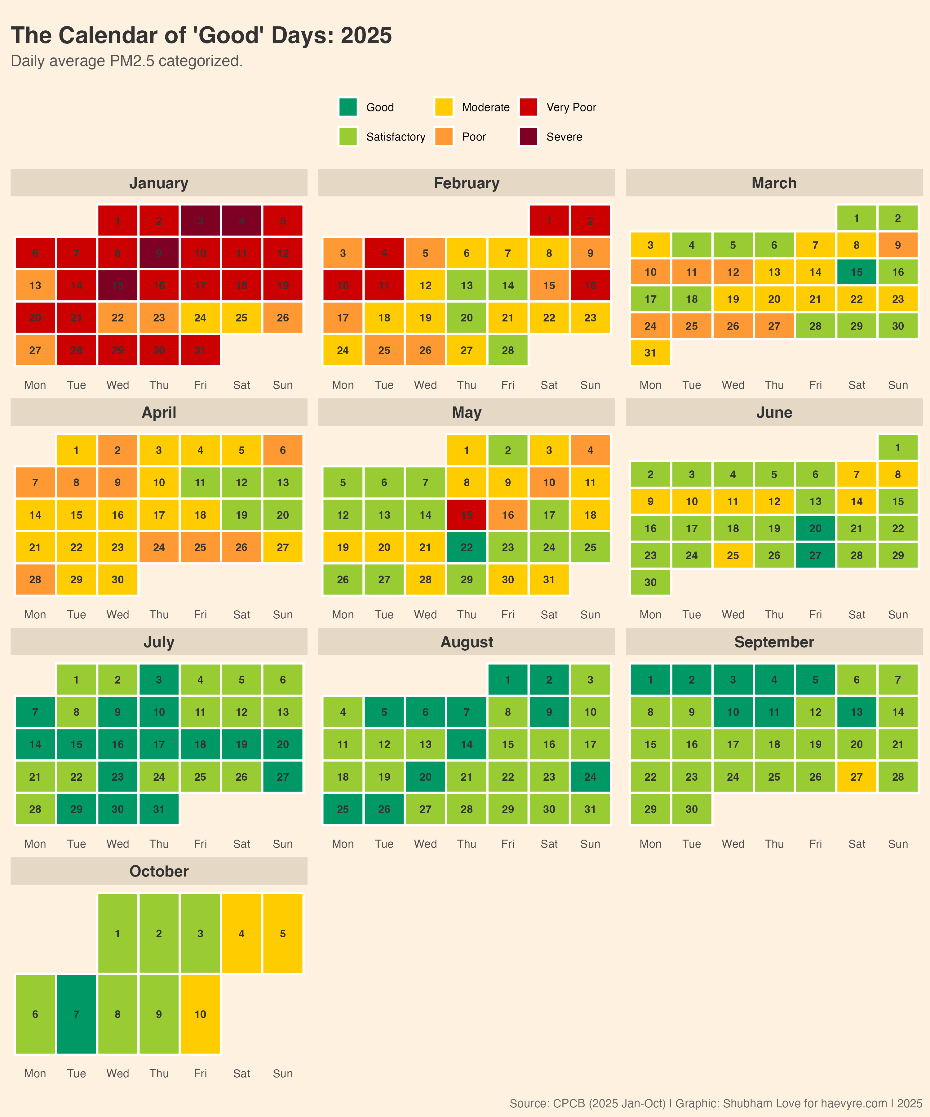 As depicted in Figure 1, days meeting the “Satisfactory” or “Good” standards appear infrequently in the dataset. The dominance of red and yellow hues illustrates the challenge residents face in accessing clean air outside of the monsoon season.