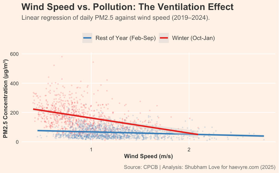 To determine whether this reduction in wind speed is a primary driver of pollution spikes, a linear regression model was used to compare wind speed against PM2.5 levels.