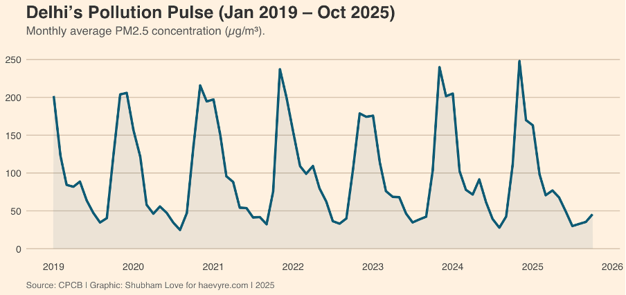 The multi-year analysis reveals a distinct “U-shape”. Pollution levels tend to slide from winter highs down to monsoon lows (July–August), before rising sharply beginning in October.