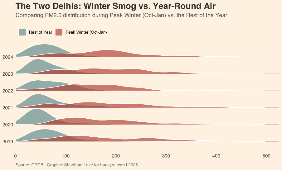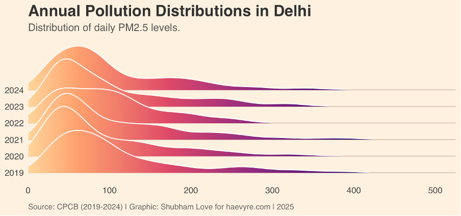 To understand the persistence of the air pollution problem, the analysis looks at the annual pollution distributions. A clear trend across the years emerges. Figure 5 stacks the PM2.5 for each year from 2019 to 2025. What is striking is the consistency of the “shape” of Delhi’s air.