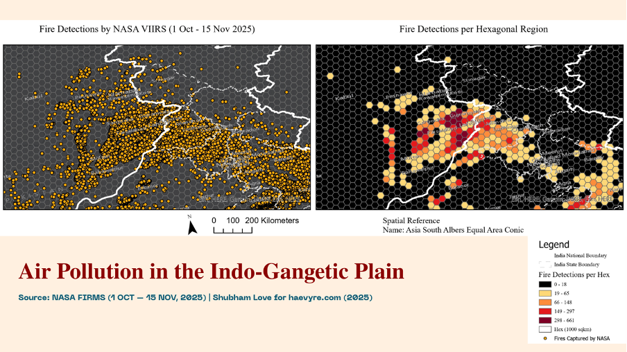 A common focal point in air pollution discussions is the contribution of external emission sources, such as stubble burning, during the onset of winter. Figure 7 makes the regional scale of the problem undeniable. The dense cluster of red hotspots is not limited to the Indian states of Punjab and Haryana; it extends seamlessly across the whole Indo-Gangetic Plain.