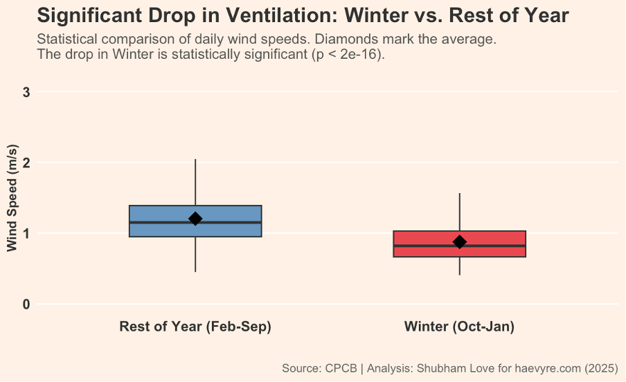The boxplots in Figure 8 illustrate this collapse in ventilation. In September, the city experiences relatively higher median wind speeds (indicated by the teal box). However, the transition into October marks a distinct meteorological shift, with the average wind speeds dropping significantly. The analysis shows a statistically significant decline (Figure 9) in wind speeds during the winter months of October to January compared to the rest of the year.